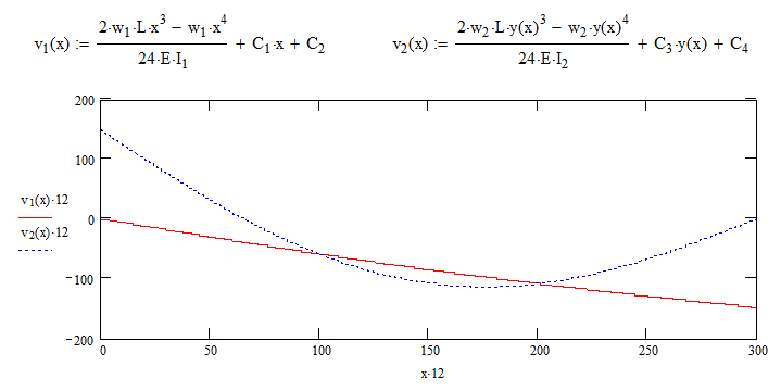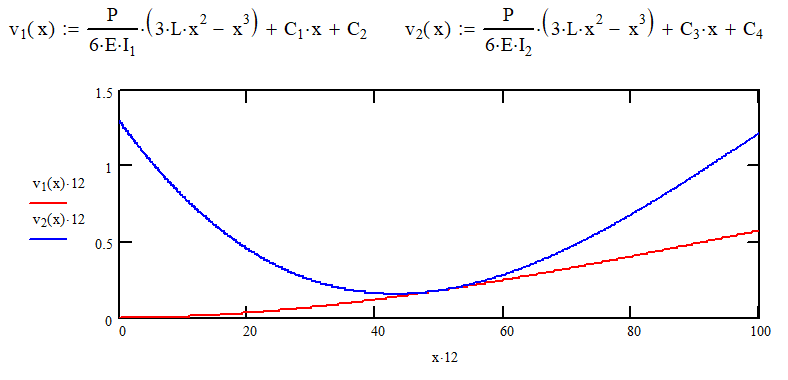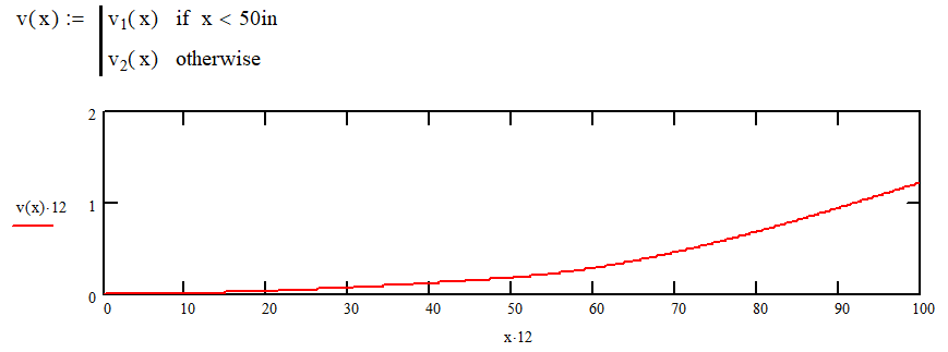 The next step is to verify the results. This is done in two steps. The first is to plot each segment over the entire length. We looking for the four boundary conditions to be met. As you can see, the lines intersect and are tangent at 50 in. Also, v1 has no deflection or slope at the base.