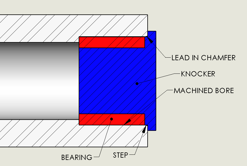 - Bearing knockers – If you are assembling this bearing in high quantities, I recommend designing a bearing knocker. The knocker is simply a steel component that matched the ID of the bearing. It has at least one step to provide good contact on the edge of the bearing when pressure is applied. The matched ID prevents the bearing from having any localized buckling. A second step may be added if the bearing is to be recessed past the surface of the bore. You may need this to get past your leading chamfer on the bore.