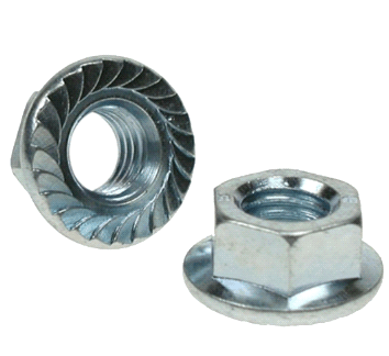 The first type is a serrated flange nut, which, when tightened has ridges that grab onto the parent material, providing a locking effect. However, these can cause issues with rust as the teeth lock onto the material scratch away paint or other coatings.