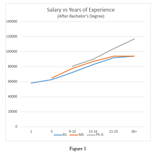With a master’s degree, the starting salary will bump up to around 60K, but two years of salary would have been lost from our total career earnings. In addition, the potential debt of student loans can compound the loss of income as well. The same occurs at the doctorate level, with annual salaries starting around 70K, but can cost up to seven years of a shortened career if you are a full time student.