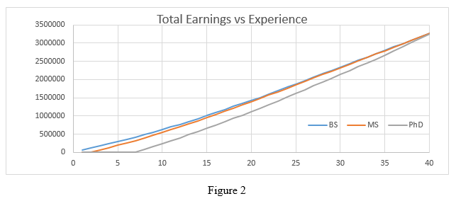 When we chart how these earnings play out over a career, a much different picture is painted. This may not be desirable to many. Figure 2 shows lifetime earnings. (Note that these engineers will make over 3 million over their careers.)
