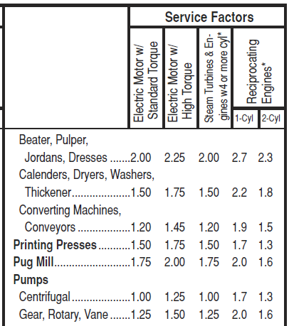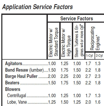 For example, something powered by an electric motor will generally have a lower service factor than one powered by an internal combustion engine. In single cylinder 4 stroke engines, every other rotation contains an impact load when the cylinder fires so there will be lots of torque for a brief moment. Electric motors have much smoother operation.