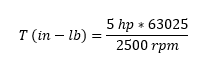 Ok, let’s get started. I have had great success using Lovejoy L series couplers for applications such as these. We first need to size the jaw part of the coupler and we do this by calculating the torque. We will use the 5 HP engine running at 2500 RPM and come up with 126 in-lb. of torque required.